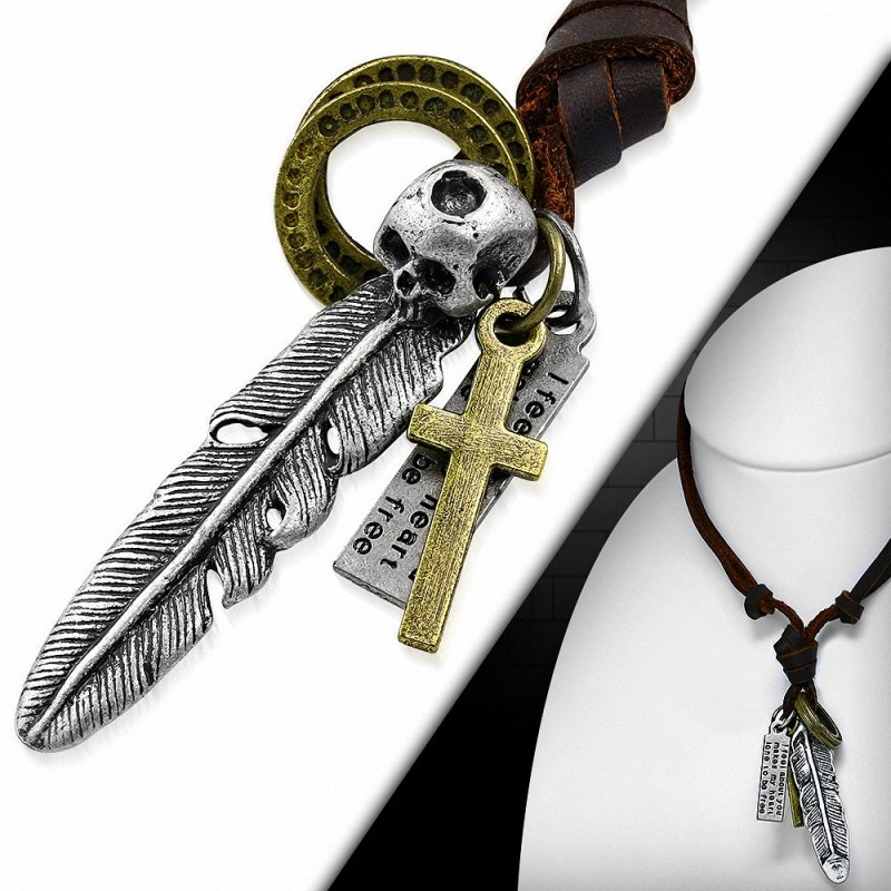 Alliage de mode 3 tons antique plume vintage oiseau / feuille de crâne croix anneau tag charm réglable motard cuir collier