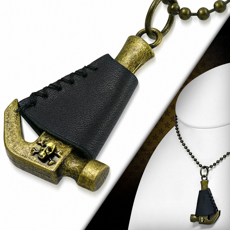 Alliage de mode 2-ton marteau outil noir en cuir véritable charm militaire lien boule chaîne collier motard