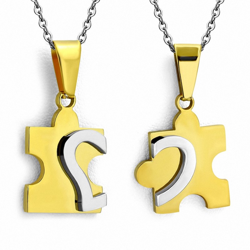 • Pendentif couple en acier doré cœur puzzle 2 parties