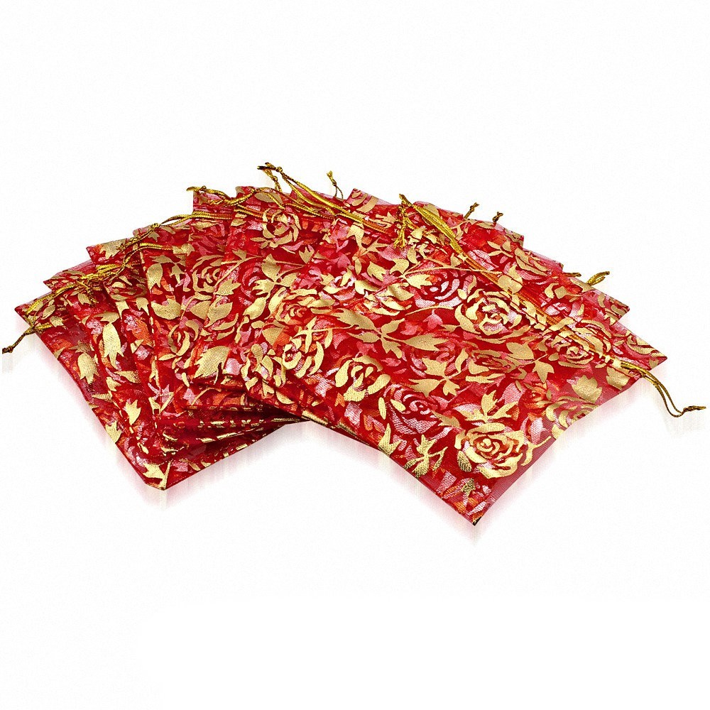 10x12cm | Sachet cadeau bijouterie en organza rouge motif fleur de vigne rose doré (unité)