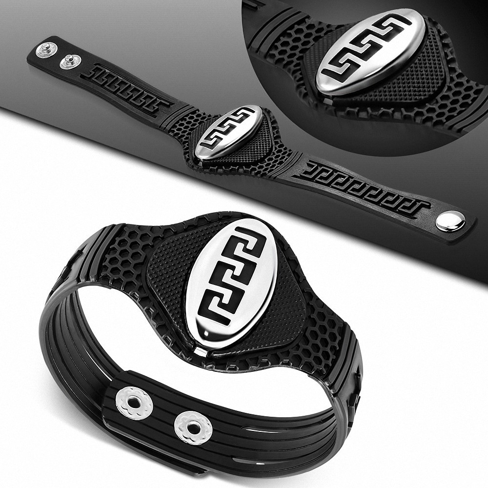 • Bracelet à pression en caoutchouc noir avec une clé ovale en forme de clé grecque à découper en acier inoxydable