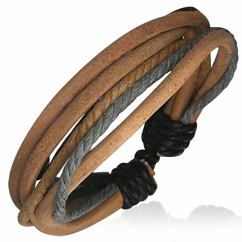 • Bracelet ajustable triple en cuir brun avec corde grise et caramel