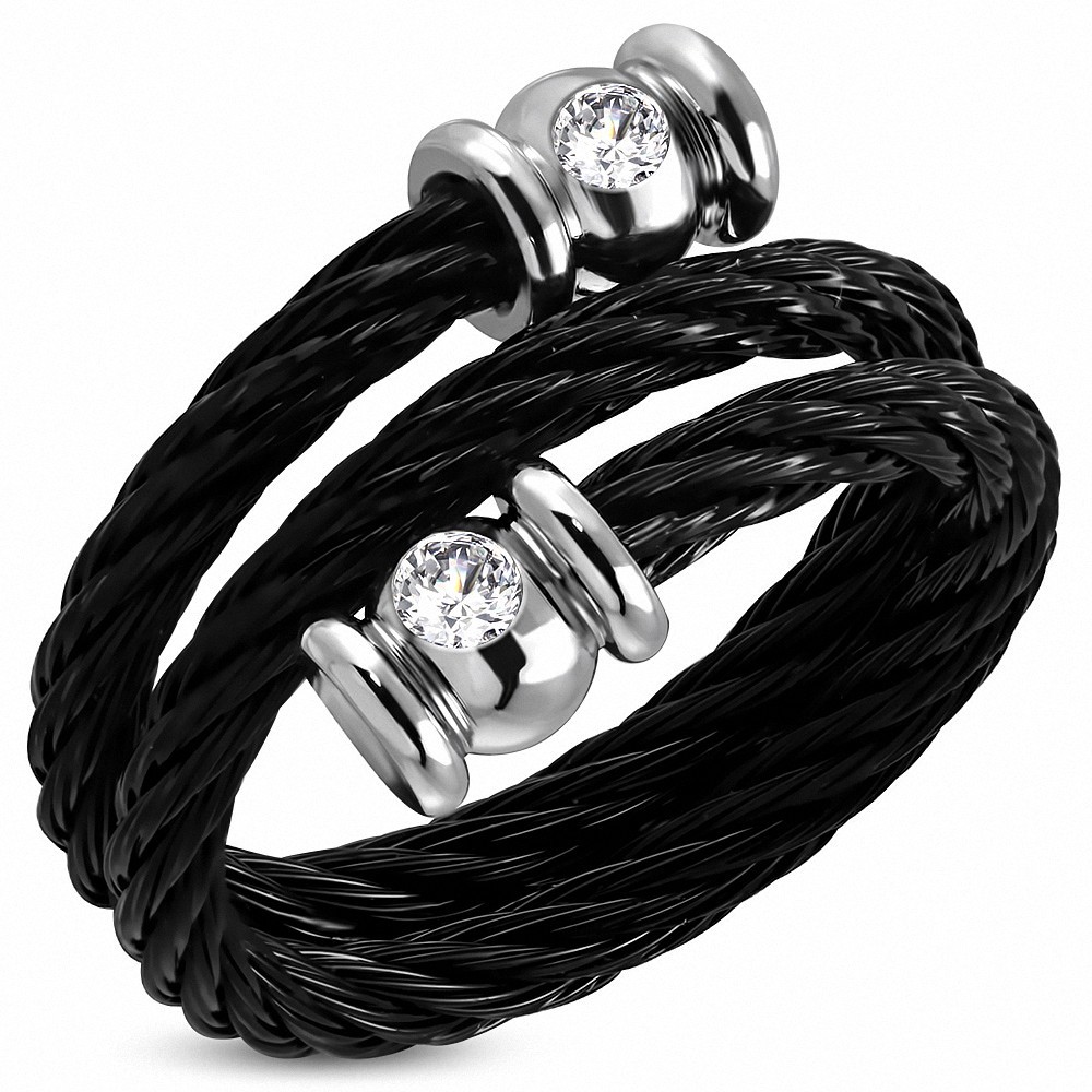 • Bague taille unique en acier inoxydable noir câble torsadé et embout en alliage argenté avec strass